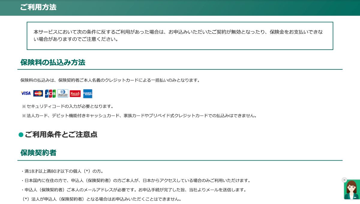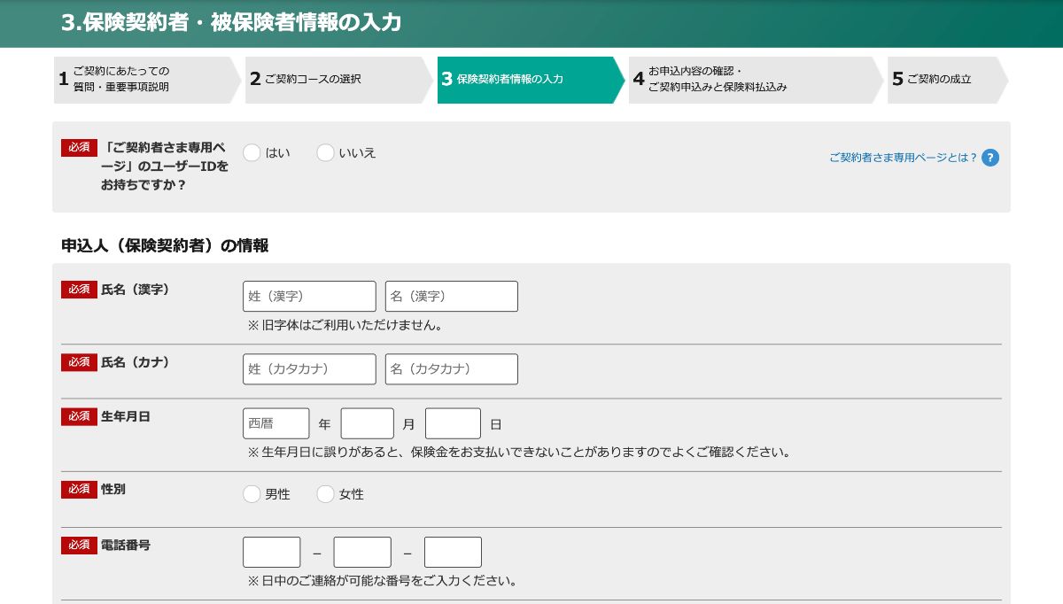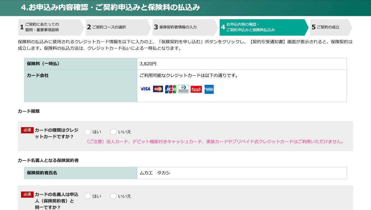 保険料をお支払いいただくクレジットカードの情報を入力します。クレジットカードは、契約者様以外の名義クレジットカードを使用できないためご注意ください。