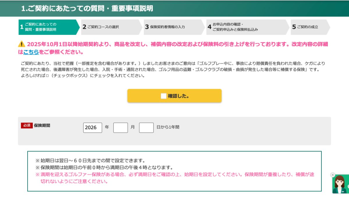 プレーの前日でのお申し込みでもご契約が可能です。 ※ご契約の決済時は、クレジットカードのみ。