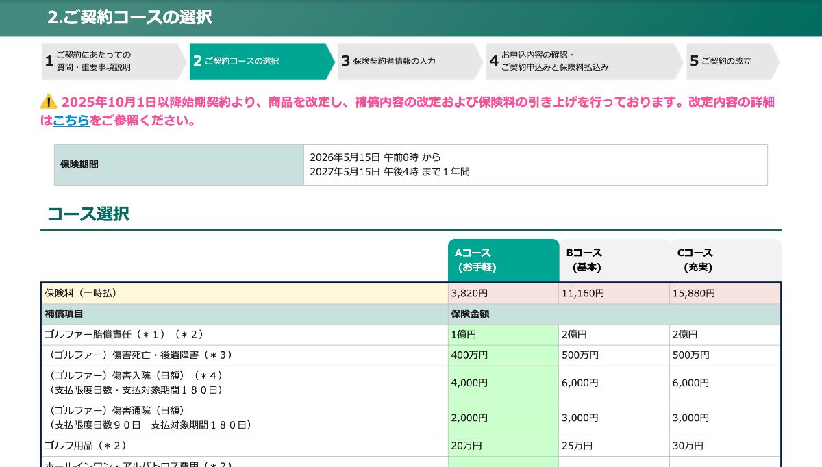 ご契約になるコースをご選択いただき、ページ下部の「次へ」をクリックしてください。コースによって、料金と補償内容が異なりますので、よくご確認ください。